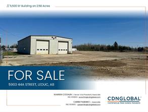 5,500 square foot freestanding building on 2.58 acres in Leduc's East Industrial area. Shop features floor drains, air lines, ventilation fans, and two 12’ x 16’ grade loading doors. Fenced and graveled yard area. Site features two access points to 44A Street, and one access point to 43rd Street. Light industrial zoning allows for a variety of uses. Low site coverage